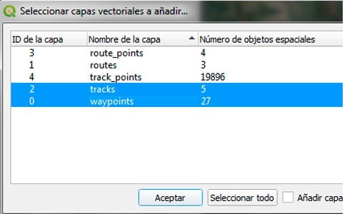 Escoja el tipo de dato que desee importar (track o waypoint, o ambos) y clic en Aceptar, luego Cerrar